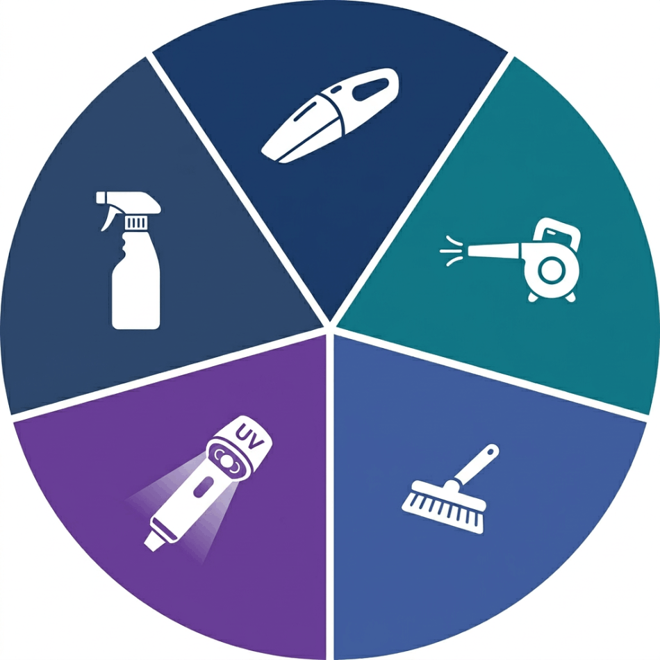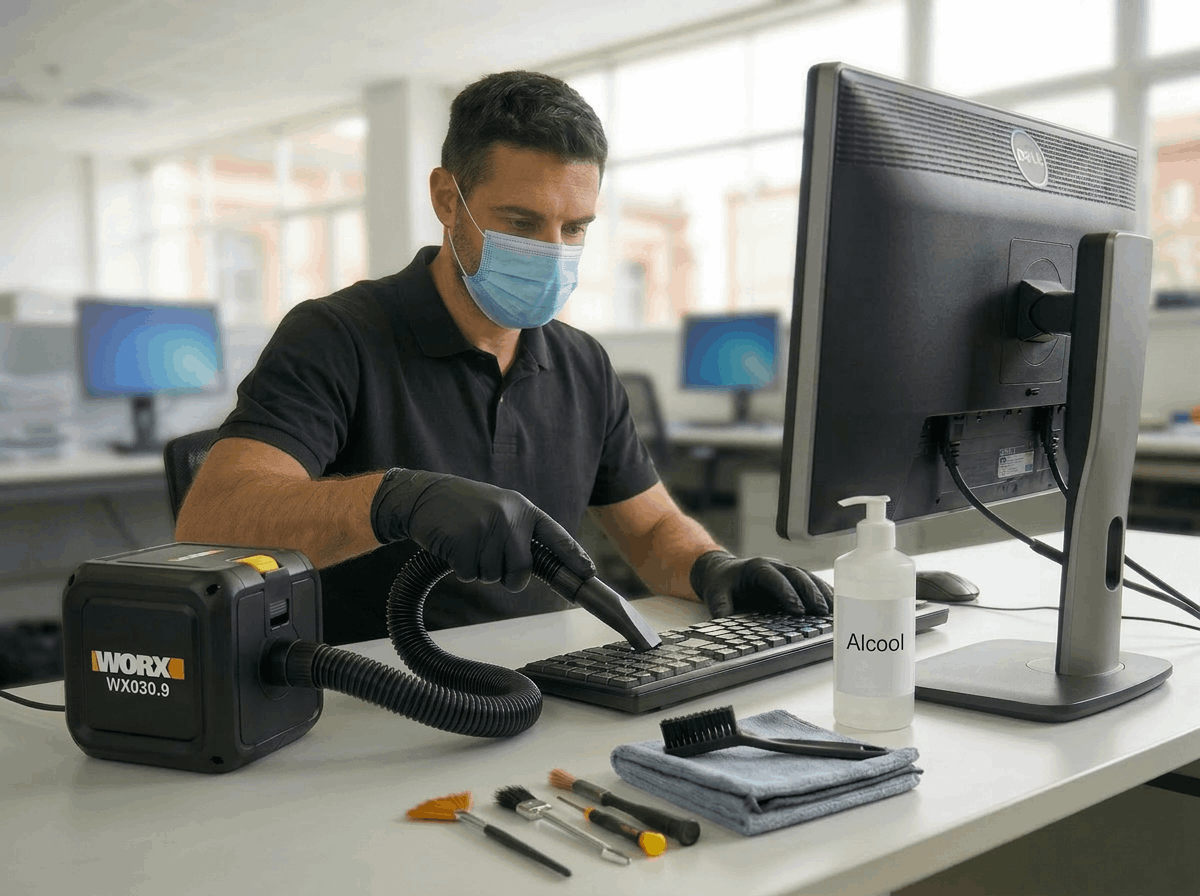 Claviers et souris accumulent bactéries, germes et résidus invisibles à l'œil nu. Grâce à l'inspection UV et à la désinfection à l'alcool isopropylique, nous éliminons 99,9% des agents pathogènes. Un poste de travail sain pour vos employés et rassurant pour vos clients.